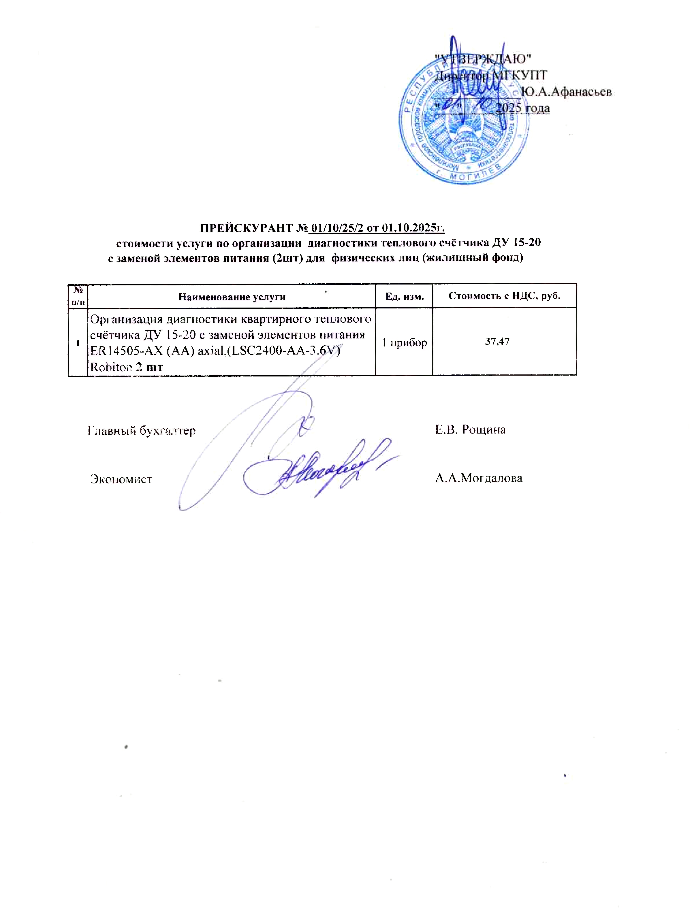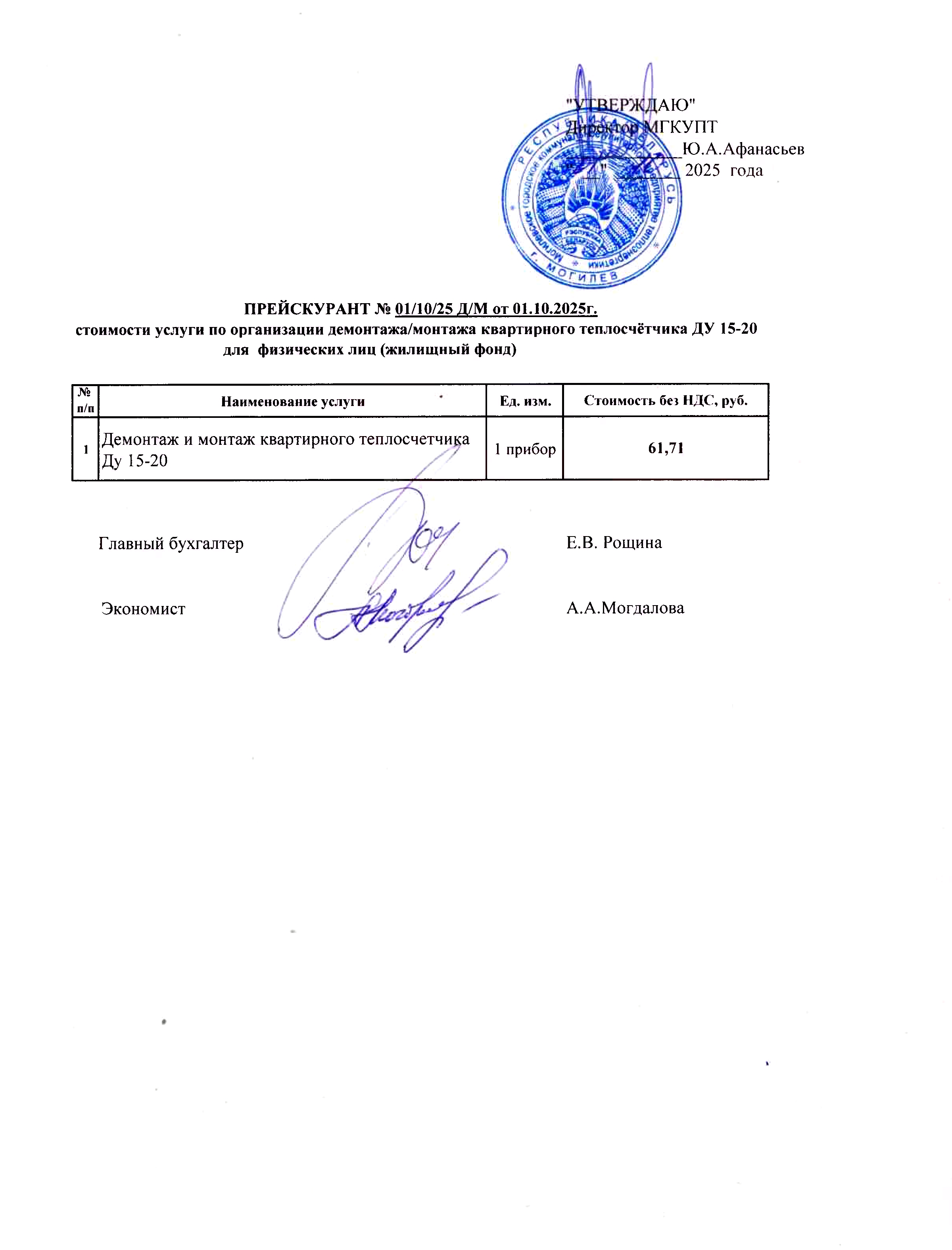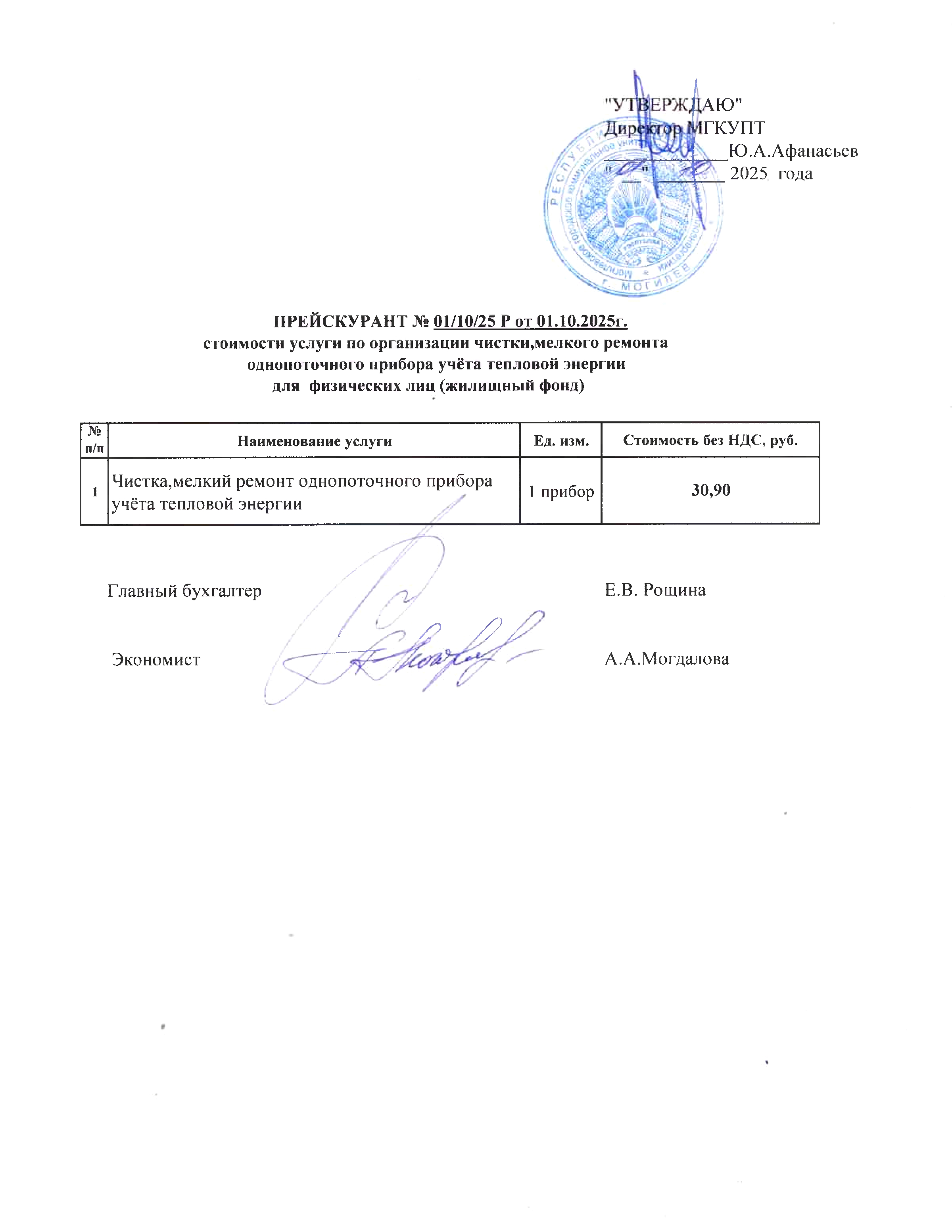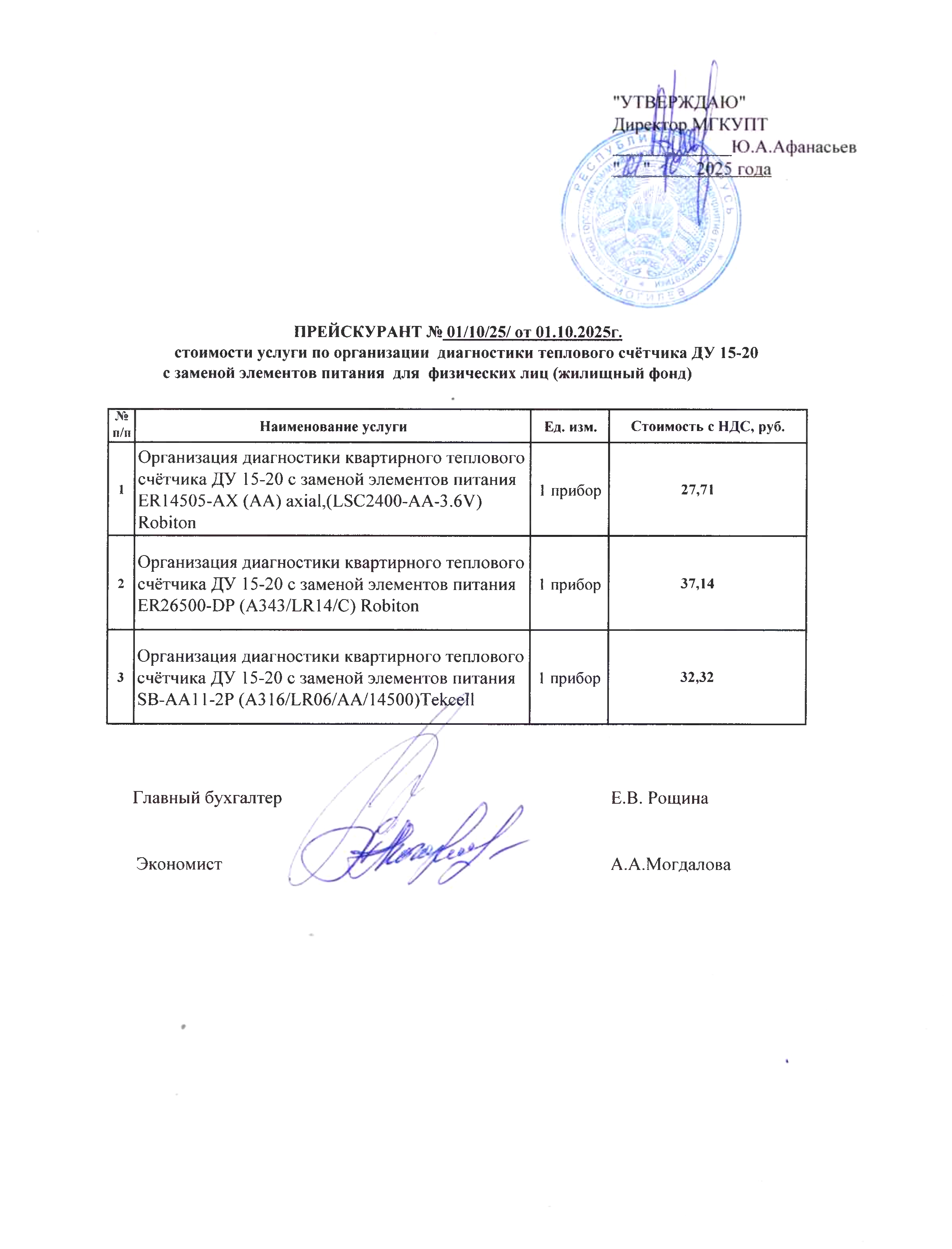 Прейскуранты на услуги, предоставляемые физическим и юридическим лицам:
