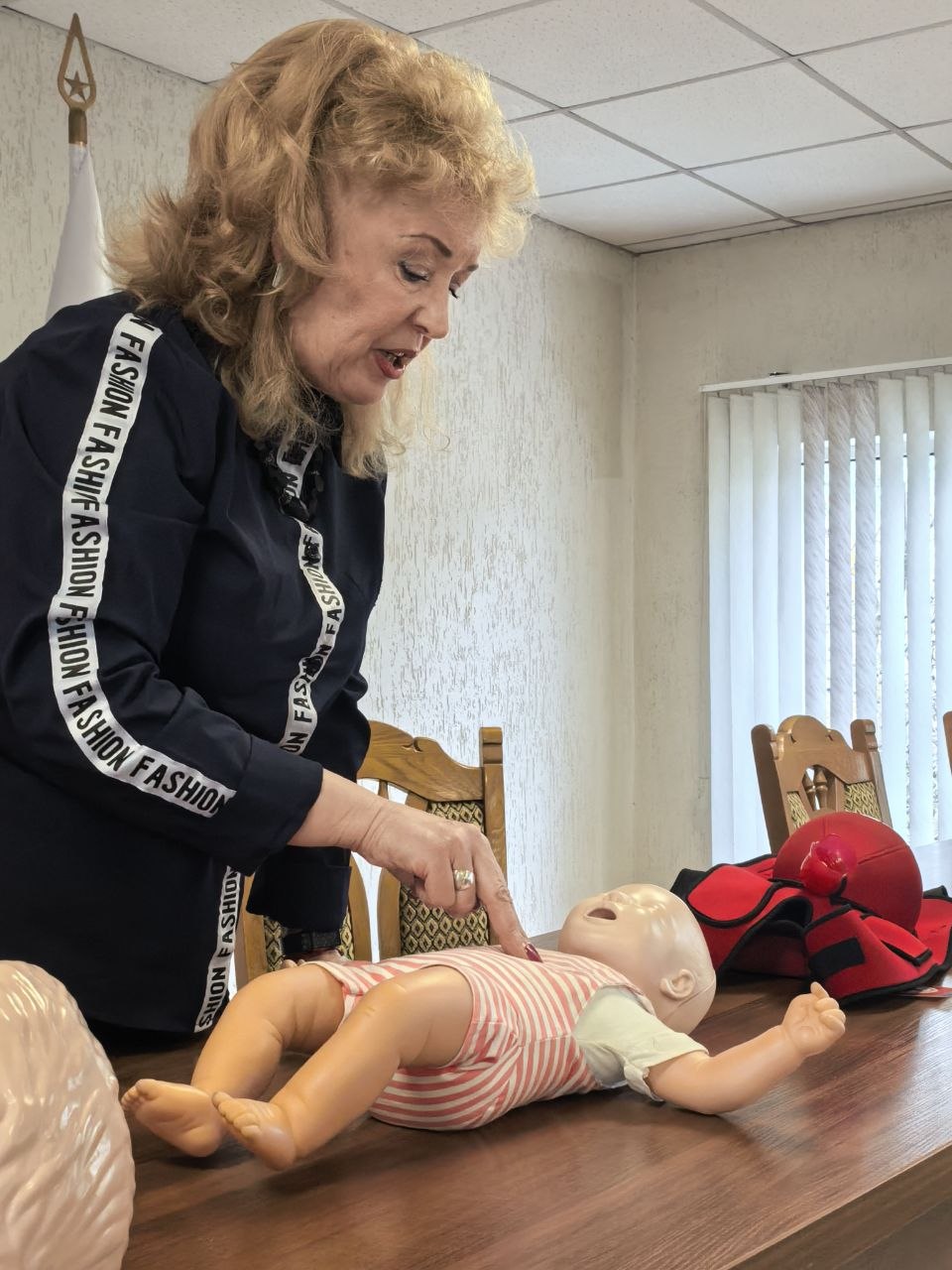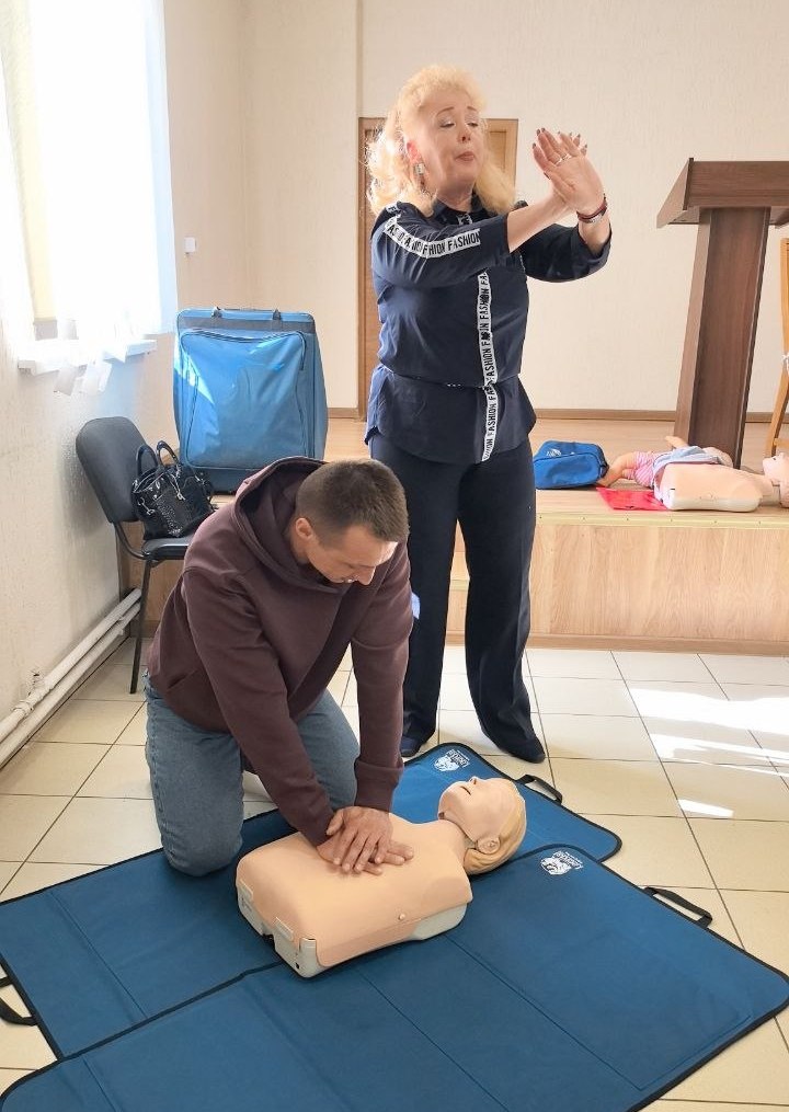 Специалист-инструктор Саренкова Ирина Викторовна подробно продемонстрировала методы и приемы оказания первой добрачебной помощи: сердечно-легочной реанимации с работой навыков на манекене.